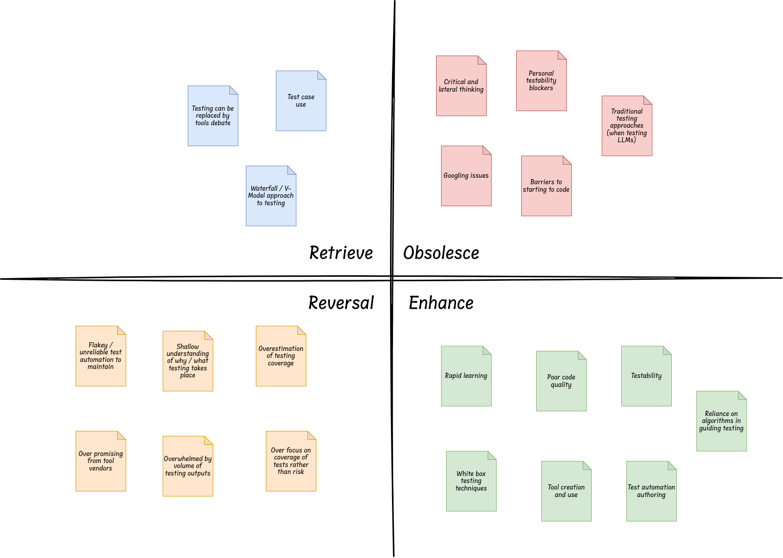 These four questions make up the Tetrad of media effects and the goal is for us to reflect on each of these questions and see what we come up with. The results of which can help us to understand further how Quality engineering might change in the world of generative AI.