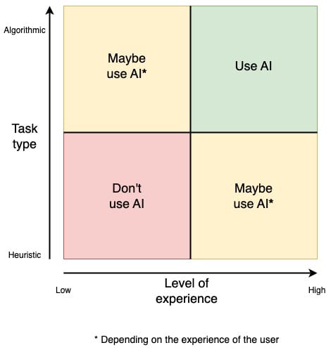 Which begs the question. How do you know if an LLM’s response is correct? When it comes to algorithmic tasks, the explicitly communicated steps themselves can be used to evaluate the outcome. However, with heuristic-based tasks, there may be no explicit information available to determine if an outcome is successful or not. Instead, we have to rely on our own experiences and intuition. With this in mind, let’s return to the question of when we should and shouldn’t use AI by graphing the type of task based on our experience around the task: